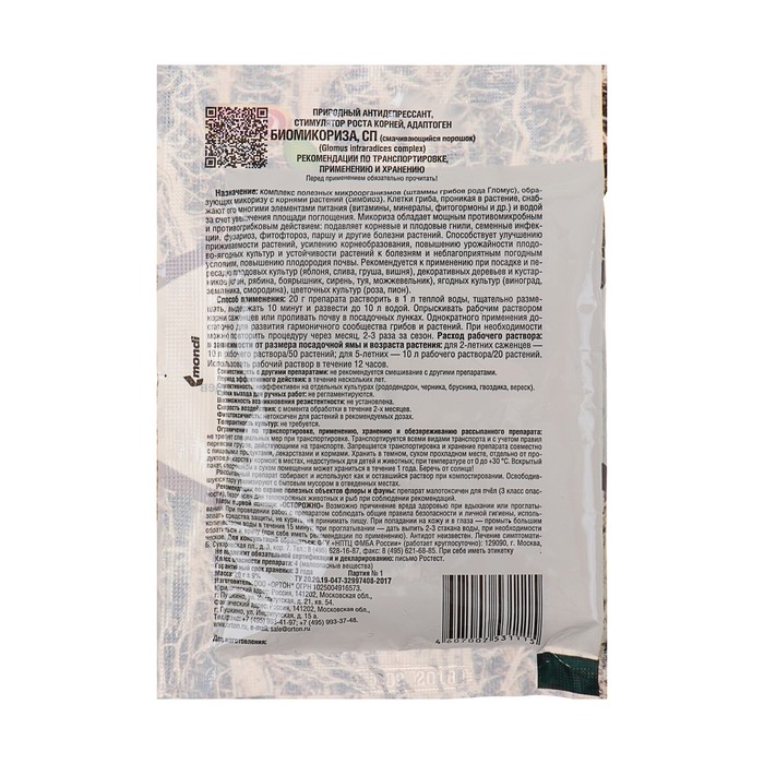 Комплекс полезных микроорганизмов (штаммы грибов рода Гломус), образующих микоризу с корнями растений (симбиоз). Клетки гриба, проникая в растение, снабжают его многими элементами питания (витамины, минералы, фитогормоны и др.) и водой за счет увеличения площади поглощения. Микориза обладает мощным противомикробным и противогрибковым действием: подавляет корневые и плодовые гнили, семенные инфекции, микроспориоз, фузариоз, фитофтороз, паршу и другие болезни растений. Способствует улучшению приживаемости растений, усилению корнеобразования, увеличению урожайности плодово-ягодных культур, повышению устойчивости растений к болезням и неблагоприятным погодным условиям, повышению плодородия почвы.