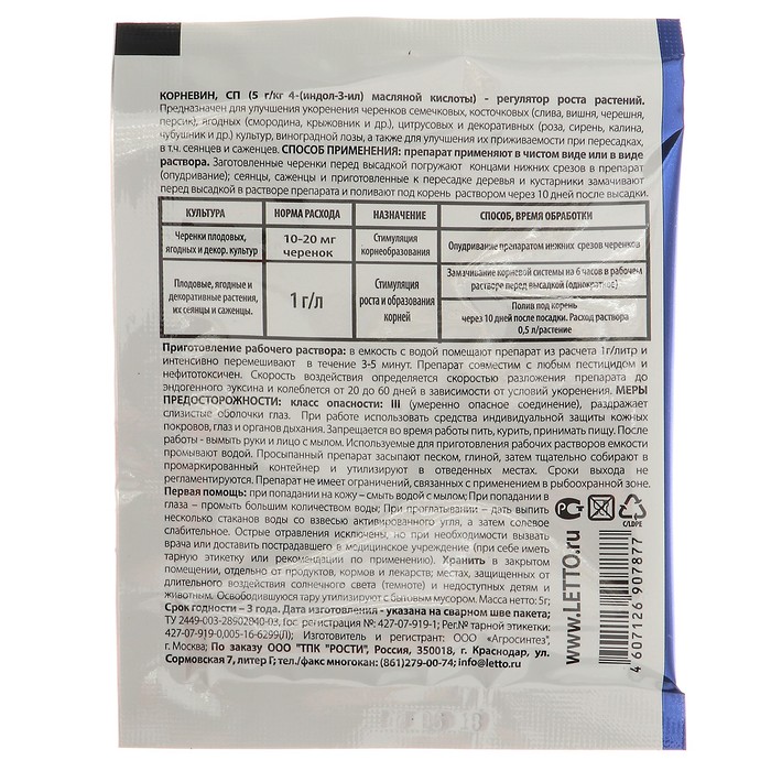 Регулятор роста растений. Предназначен для улучшения ускорения черенков семечковых, косточковых (слива, вишня, черешня, персик), ягодных (смородина, крыжовник и др.), виноградной лозы, цитрусовых и декоративных (роза, сирень, калина, чубушник и др.) культур, а также для улучшения их приживаемости при пересадках, в том числе сеянцев и саженцев.