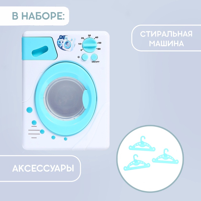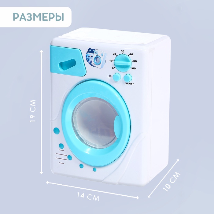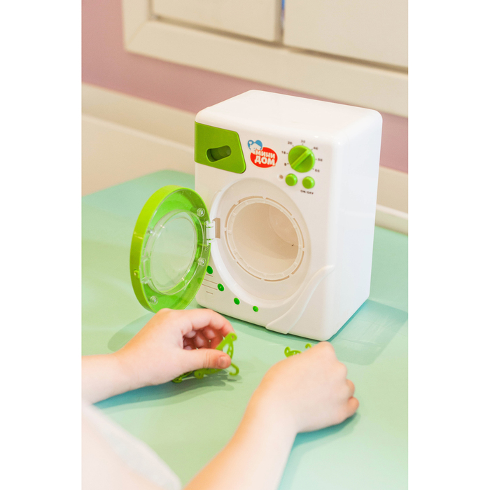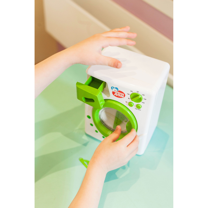 Игрушка работает почти как настоящий прибор: есть отсек для порошка и регулятор температуры воды, барабан крутится и издаёт звуки, а лампочка горит во время «стирки».