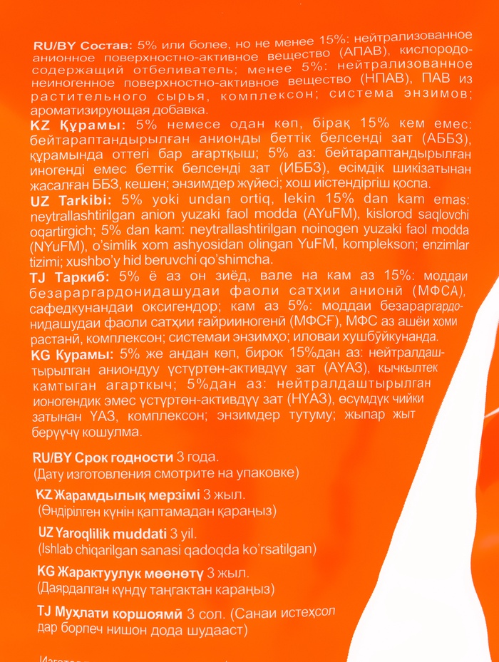 Формула EXPERT глубоко проникает в волокна ткани, устраняя пятна и повседневные загрязнения, при этом бережно ухаживая за тканями. Он подходит для цветного и белого белья, обеспечивая идеальную чистоту, свежесть и долгий срок службы вещей.