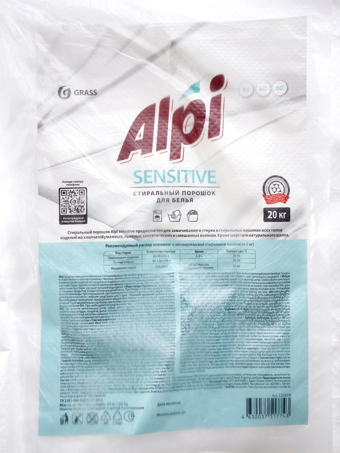 Средство моющее синтетическое порошкообразное Alpi sensitive предназначено для замачивания и стирки белья из хлопчатобумажных, льняных, синтетических тканей, а также тканей из смешанных волокон (кроме изделий из натурального шёлка и шерсти) в стиральных машинах любого типа, профессиональных стиральных машинах(промышленных) и ручной стирки.