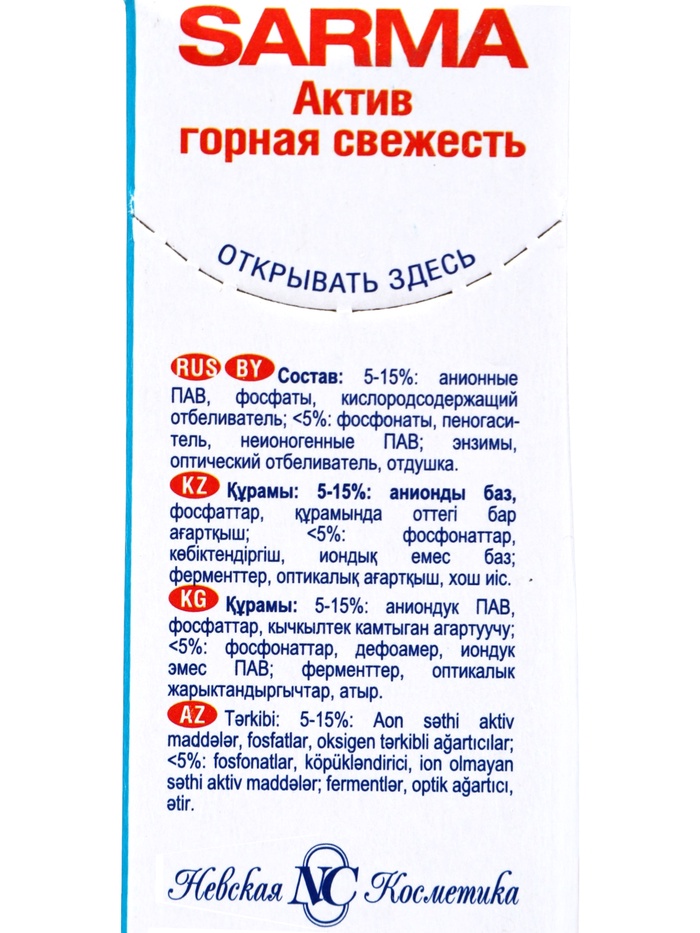 Используйте для хлопчатобумажных, льняных, синтетических и смешанных тканей стиральный порошок Sarma «Актив: Горная свежесть».