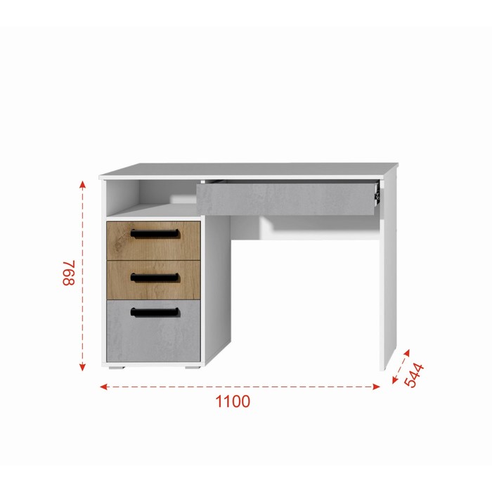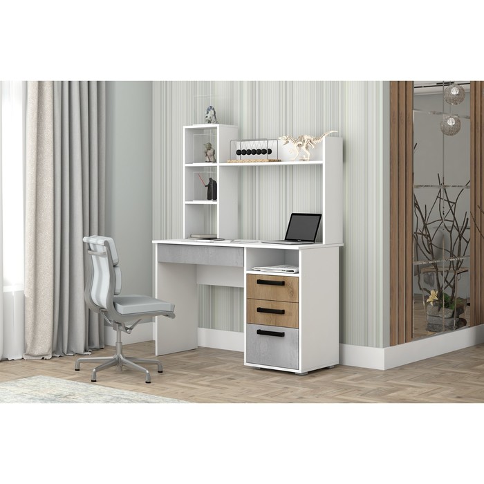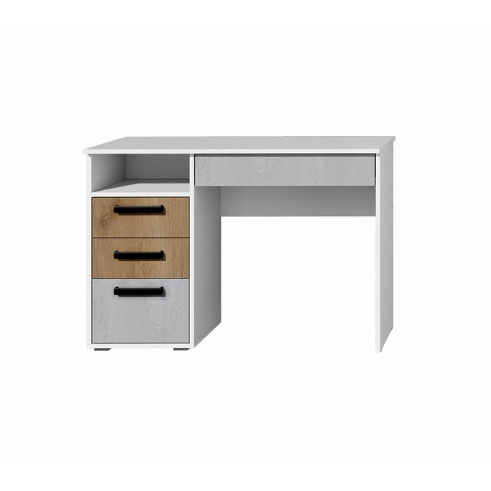 Стол компьютерный Юпитер, 1100х544х768, Белый/Крафт золотой/Бетон удобный, компактный и вместительный, подходящий для современного лаконичного интерьера. В четырех выдвижных ящиках с шариковыми направляющими и на полке всегда под рукой тетради и другие школьные принадлежности.