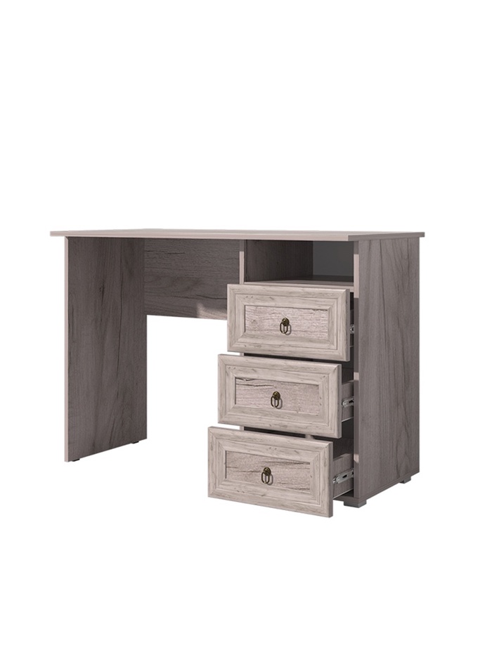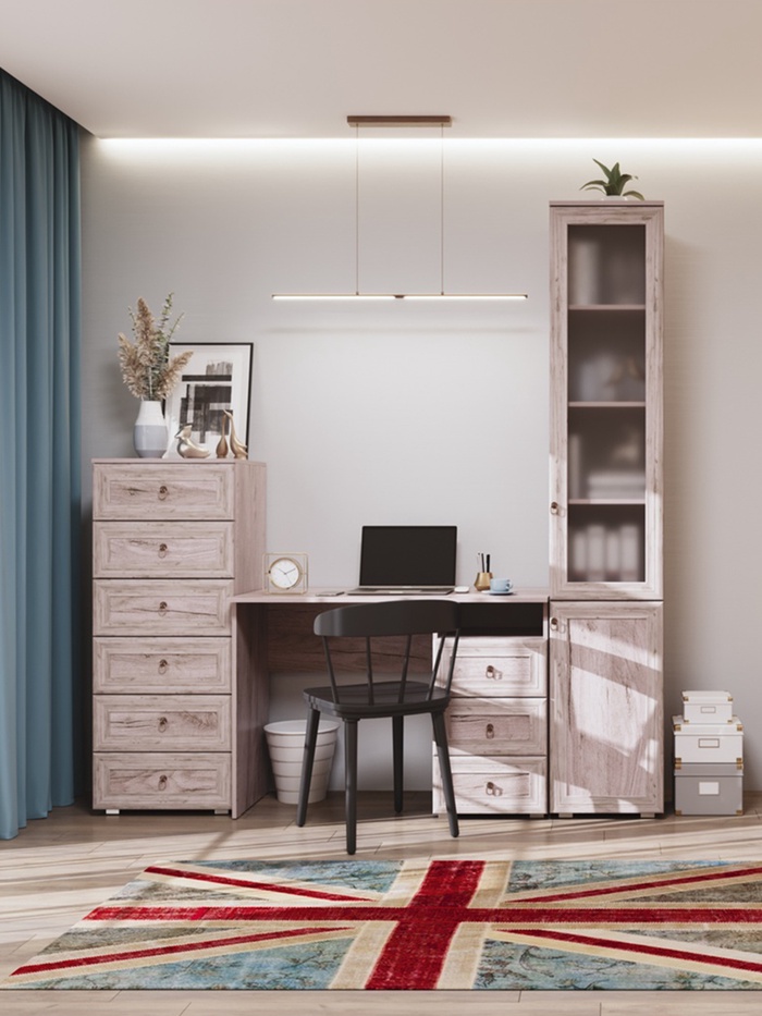 Функциональное и стильное решение для организации учебного места ребёнка или подростка. Письменный стол выполнен в благородном оттенке дуб серый крафт с выразительной древесной текстурой, которая привносит в интерьер природную гармонию и современный характер. Декоративная фрезеровка на фасадах ящиков добавляет изысканности и визуального интереса.