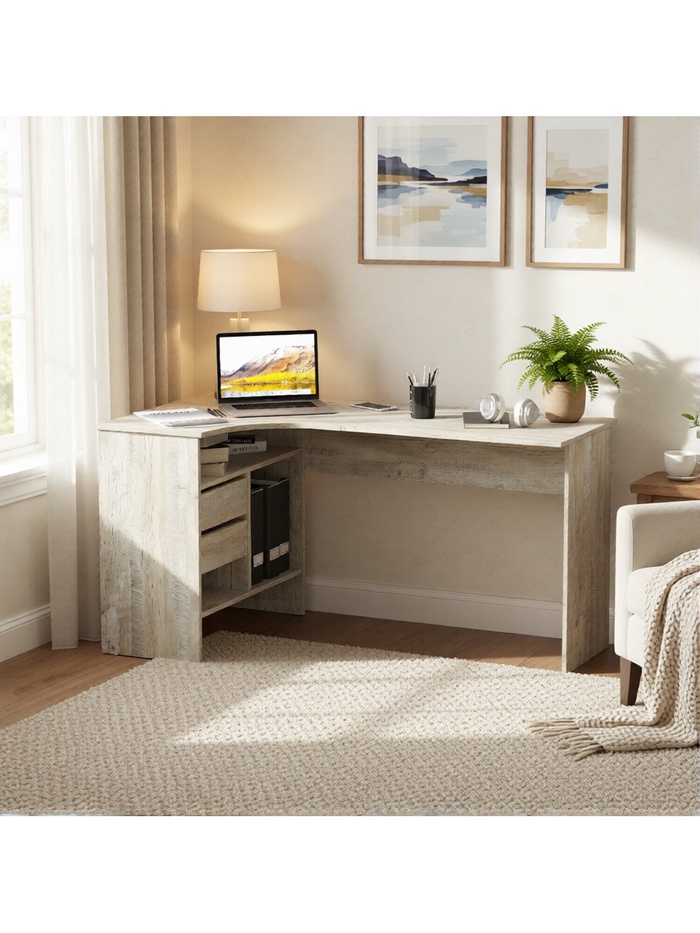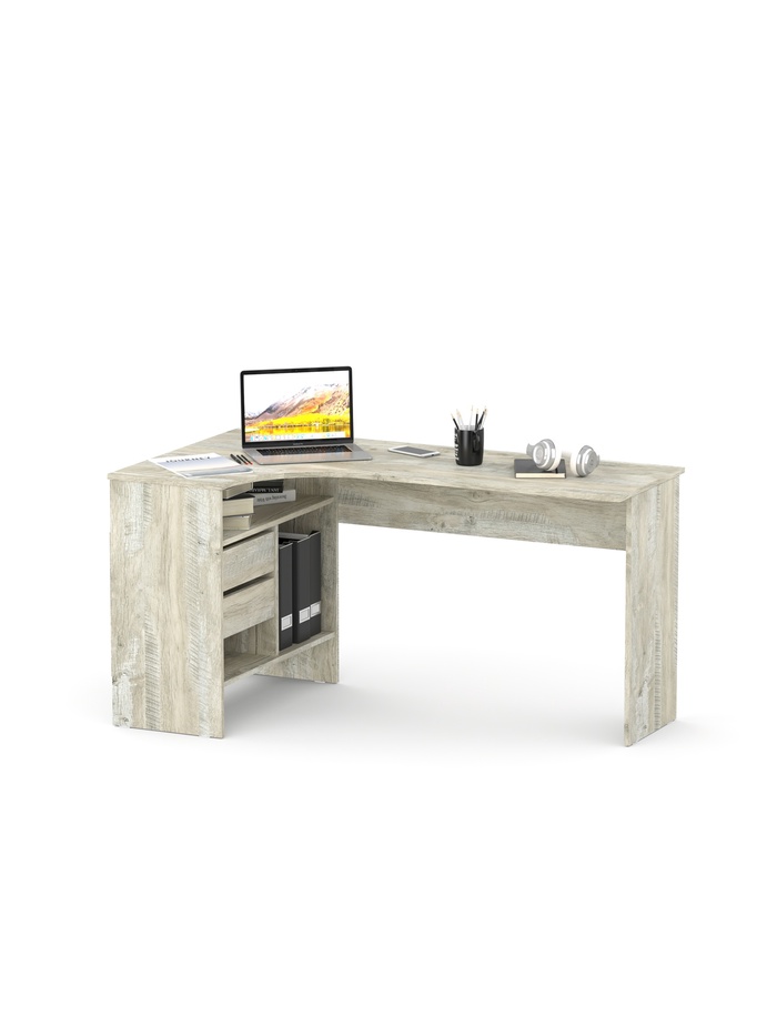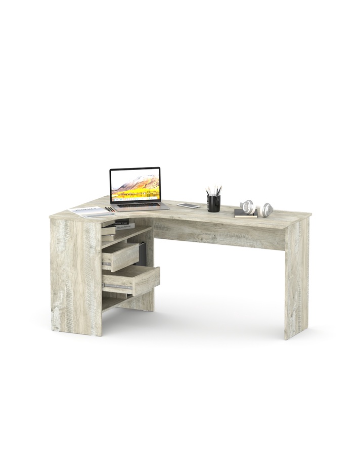 Широкая столешница обеспечивает достаточно места для размещения монитора, клавиатуры, ноутбука и другой необходимой техники. Продуманная система хранения включает выдвижные ящики и открытые отделения, в которых удобно хранить документы, книги и канцелярские принадлежности.