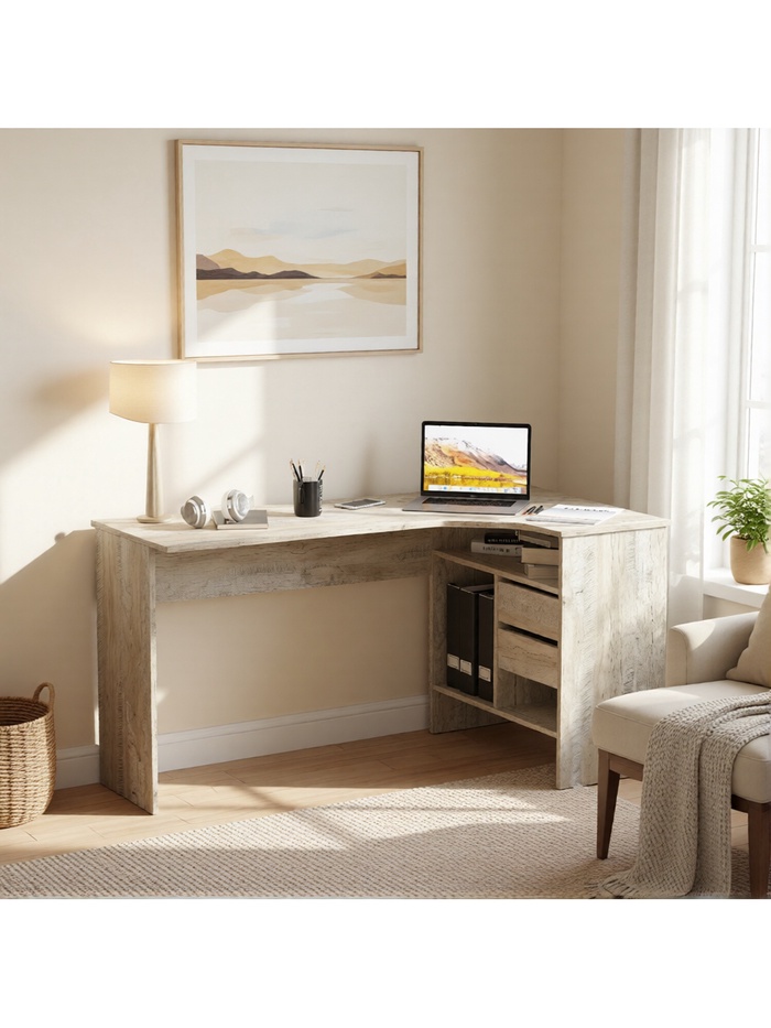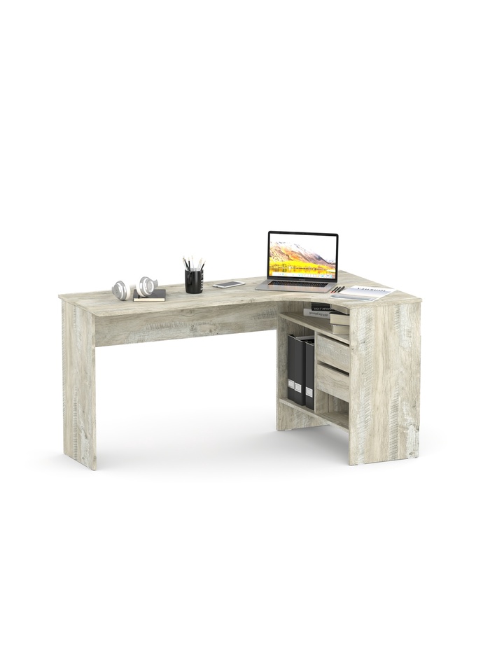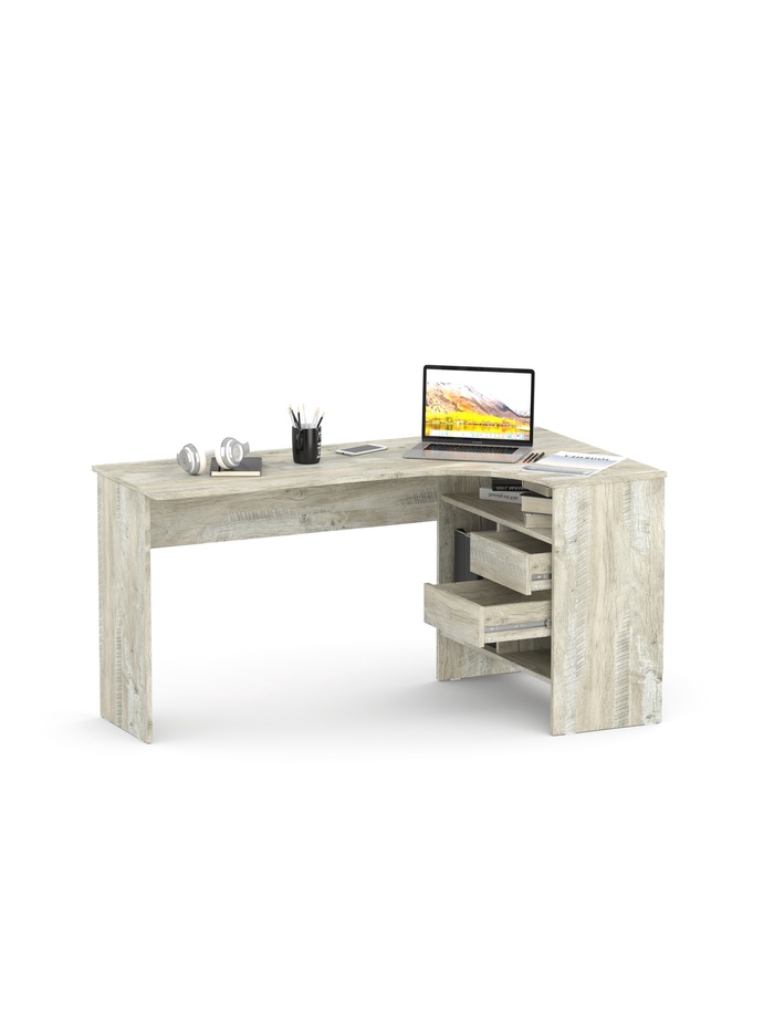 Широкая столешница обеспечивает достаточно места для размещения монитора, клавиатуры, ноутбука и другой необходимой техники. Продуманная система хранения включает выдвижные ящики и открытые отделения, в которых удобно хранить документы, книги и канцелярские принадлежности.