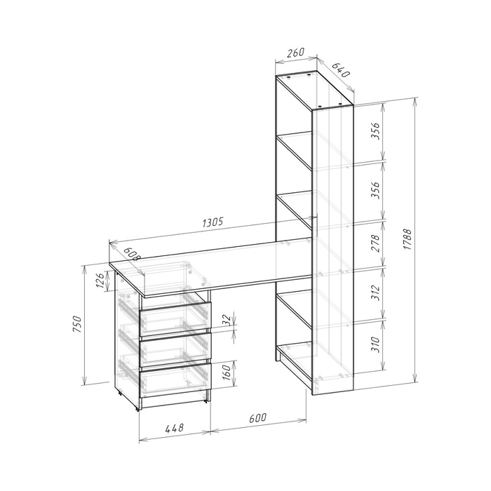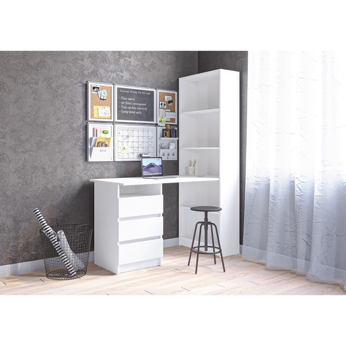 Cтол письменный со стеллажом Зара - идеальное решение для тех, кто ценит стиль, функциональность и качество. Сочетает в себе преимущества просторного письменного стола, вместительного стеллажа с 4 полками, тумбы с одной открытой полкой и 3 выдвижными ящиками, превращаясь тем самым в полноценное рабочее место в офисе или функциональное место для школьника в детской комнате. На столе хватит места для ноутбука и компьютера, а стеллаж и ящики можно использовать для книг, канцелярии или документов. Письменный стол Зара со стеллажом выполнен без ручек и лицевой фурнитуры. Стильные белые матовые фасады идеально впишутся в помещение в современном, лофт или скандинавском стиле.