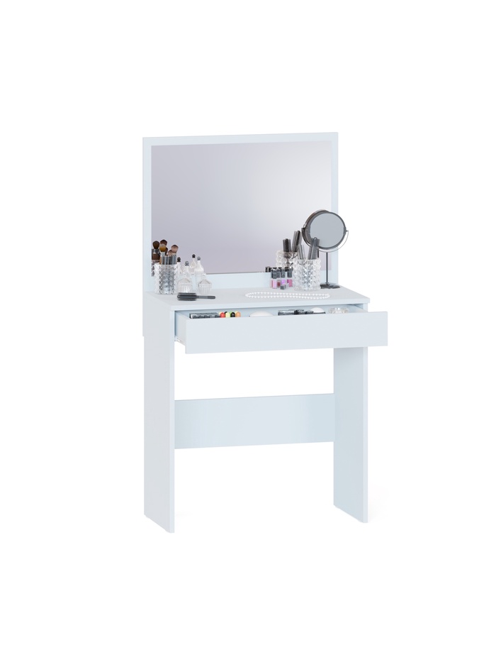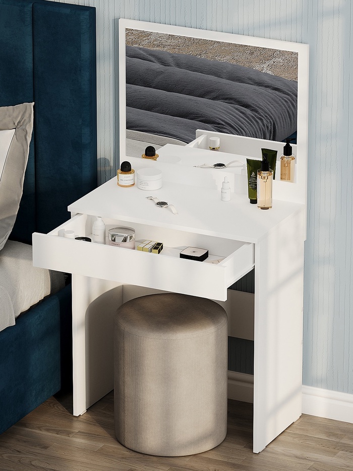 Выдвижной ящик помогает аккуратно хранить косметические средства и мелкие предметы, поддерживая порядок на рабочей поверхности. Качественные материалы обеспечивают прочность конструкции и долгий срок службы мебели.