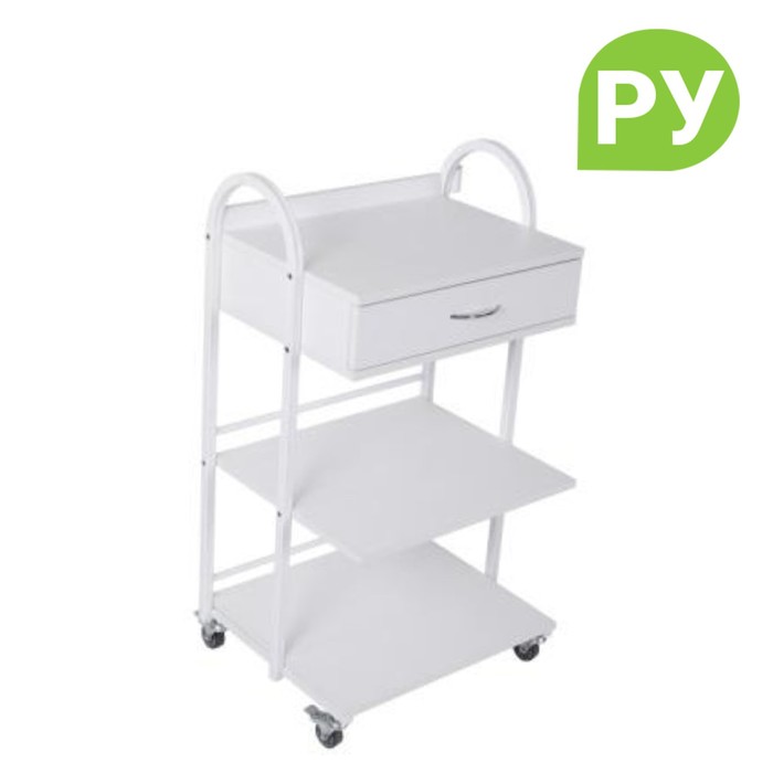 Столик для профессионального использования на металлическом каркасе белого цвета с двумя полками из ЛДСП, выдвижным ящиком и специальным креплением для лампы-лупы.