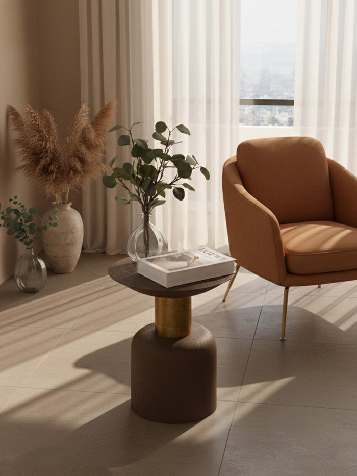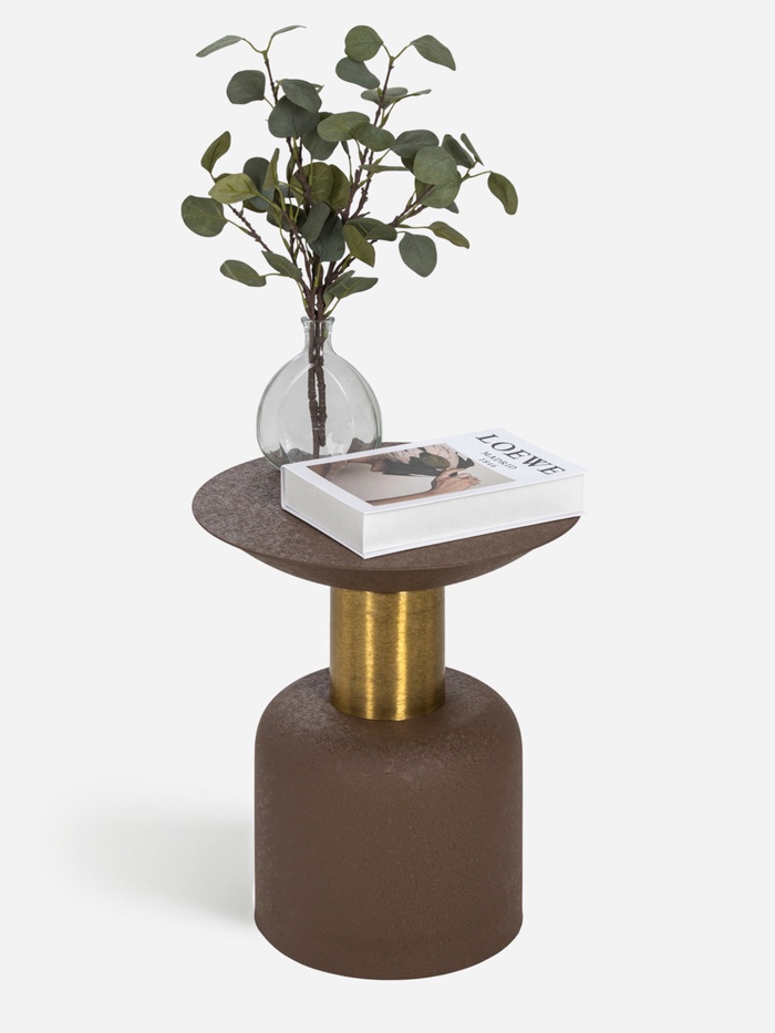 Невысокий круглый столик из металла в насыщенном коричневом оттенке «Какао с золотом». Его компактные размеры и стабильная форма делают его идеальным спутником для дивана или кресла, создавая удобную поверхность для чашки кофе, книги или пульта.
