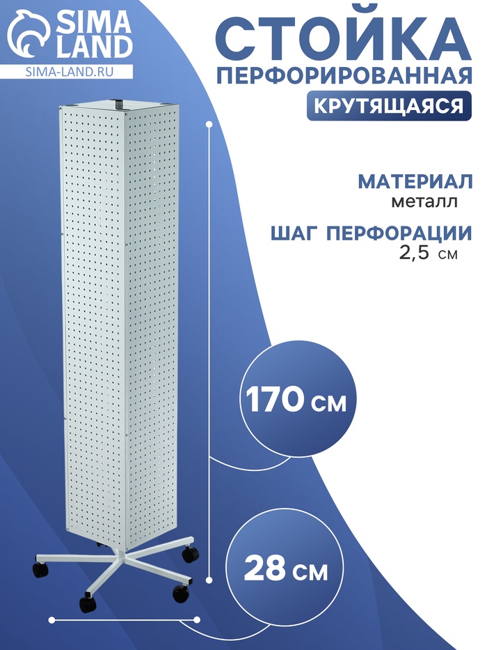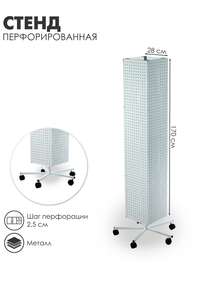 Стойка перфорированная на колёсах, 4 стороны, размер 28×28×170 см, шаг 2,5 см, цвет белый — это практичное и функциональное решение для организации пространства. Эта стойка идеально подходит для магазинов, выставочных залов, офисов или для дома, где требуется удобное и компактное хранение различных товаров или аксессуаров. Благодаря перфорированным стенкам, вы можете легко и надежно размещать различные предметы, подвешивать аксессуары или товары, что делает её идеальной для демонстрации продукции или для хранения.