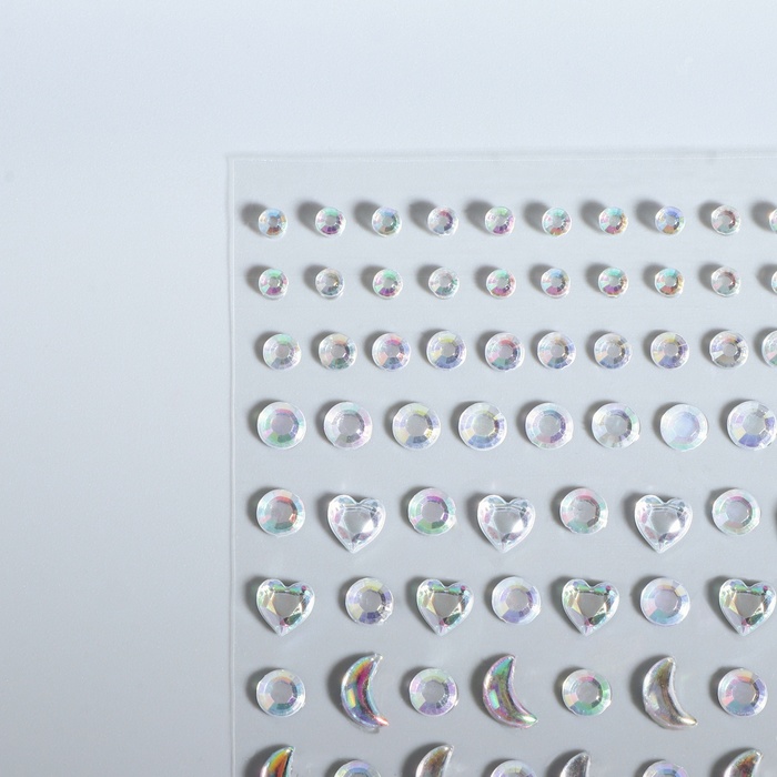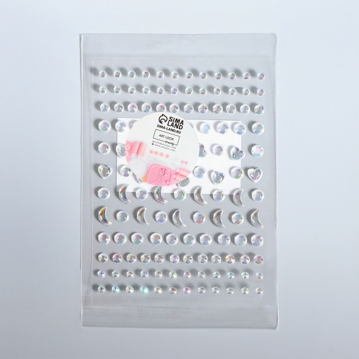 В набор входят стразы разных форм и размеров: круг — 2,5 / 3 / 5 мм; сердце — 6 мм; месяц — 7,5 мм.