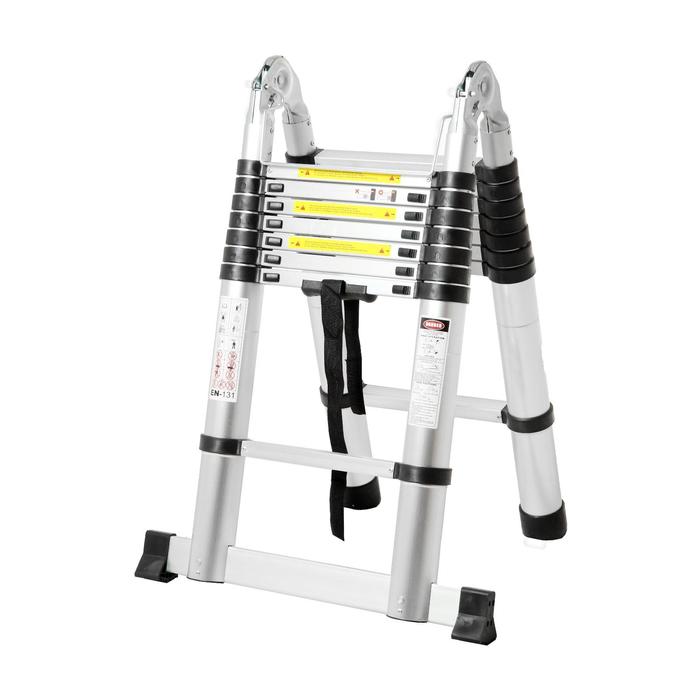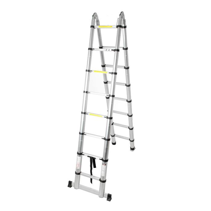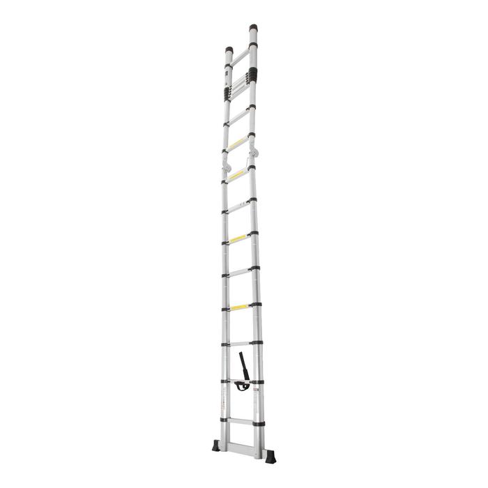 Лестница достаточно лёгкая, ведь изготовлена из алюминия. А для удобного хранения в комплекте идёт ремешок на липучке для фиксации.