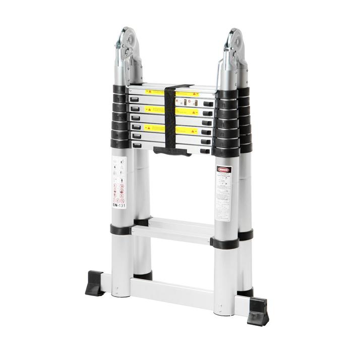 Лестница идеально подойдёт для тех, кто бережёт свободное пространство. В сложенном виде её высота не превышает 80 см, она прекрасно уместится в шкафу, на балконе и под кроватью. Для того чтобы её разложить, достаточно потянуть за верхнюю ступень вверх. Характерный щелчок означает, что уровень зафиксирован, можно вытягивать следующий. За пару секунд лестница увеличится с 80 см до 2,5м, и так же быстро она собирается обратно.