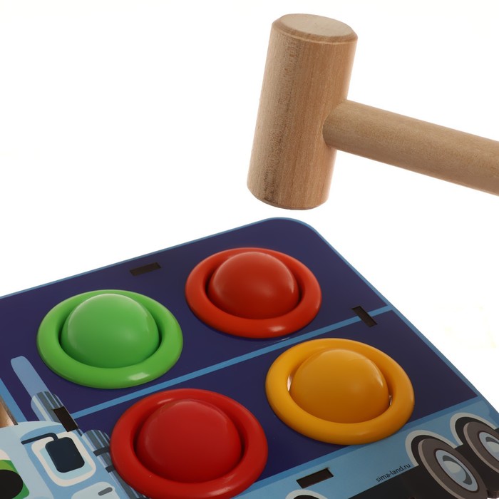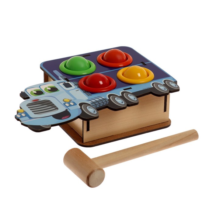 - Простой механизм: ребёнок забивает шарики в отверстия молотком, а они выкатываются обратно, создавая эффект бесконечной игры.