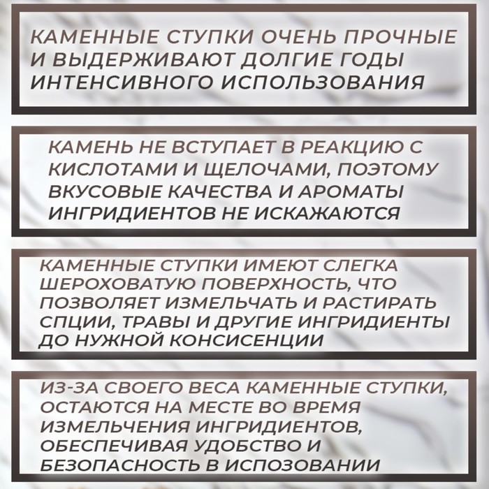 - Из-за своего веса каменные ступки остаются на месте во время измельчения ингредиентов, обеспечивая удобство и безопасность использования.