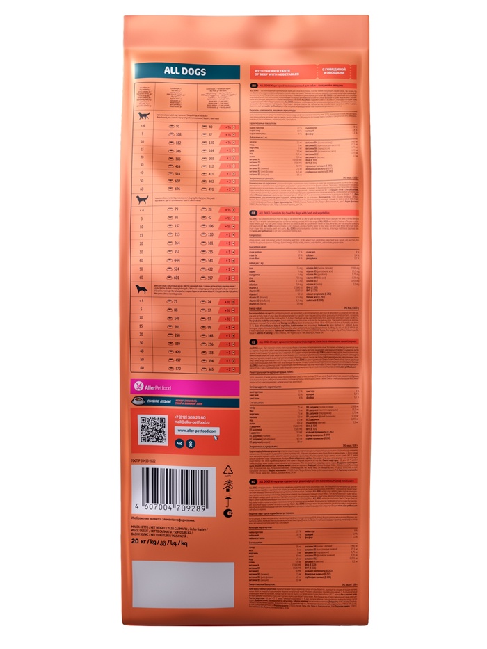 ALL DOGS — это полноценный премиальный корм для собак всех пород. Разработан на основе результатов последних исследований в области питания домашних животных, а также с учетом международных стандартов (AAFCO/FEDIAF).
