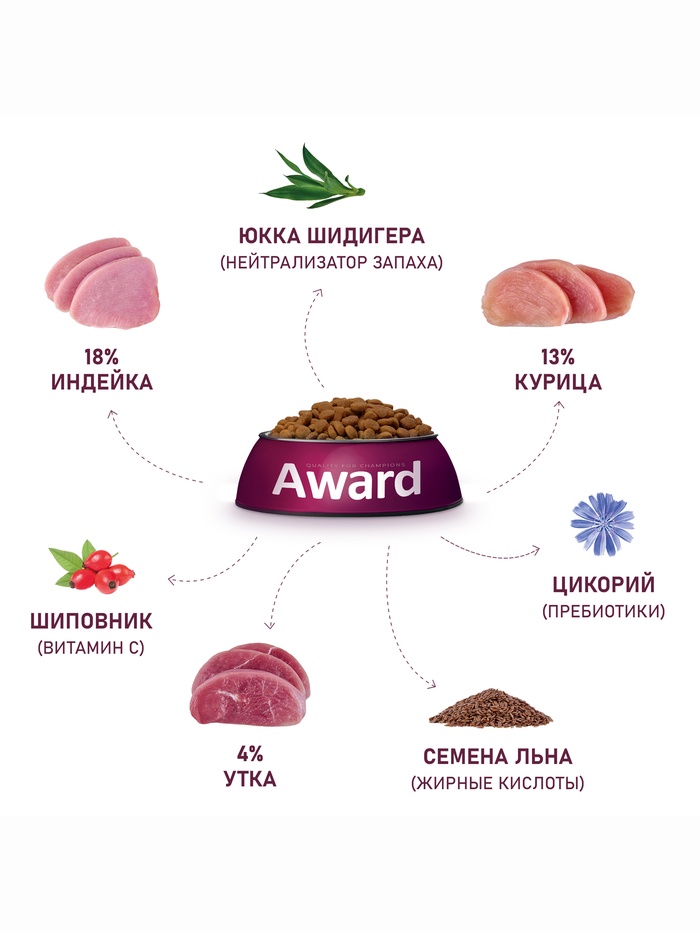 - Белок из утки и индейки: Основные источники протеина легко усваиваются и отвечают потребностям активных кошек от 1 до 7 лет.