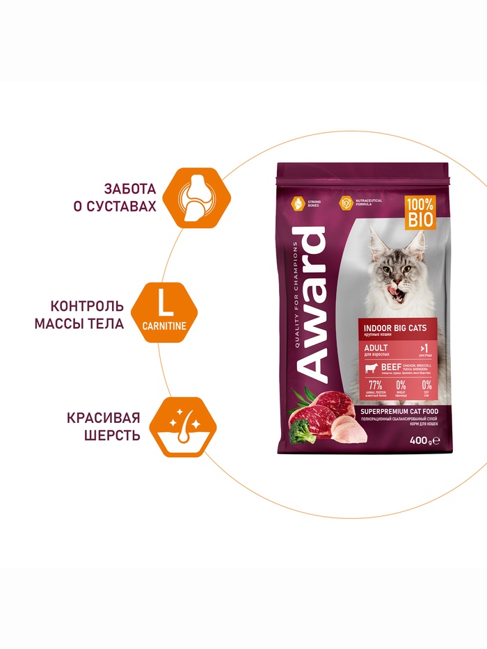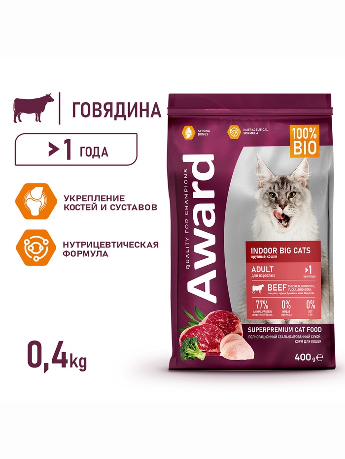 Рацион для крупных домашних кошек в удобной упаковке. Сухой корм с говядиной для взрослых кошек крупных пород поддерживает здоровье питомца и подходит для ежедневного питания.