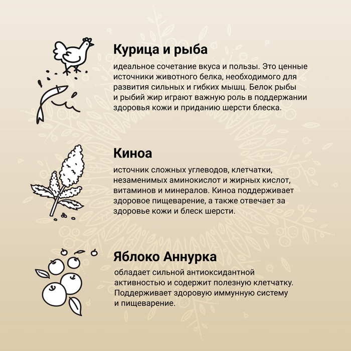 - Двойной белок: курица и рыба: Состав включает два источника животного белка, отвечающих потребностям кошачьего организма. Такой дуэт нравится многим кошкам и помогает поддерживать мышечную массу и общий тонус.