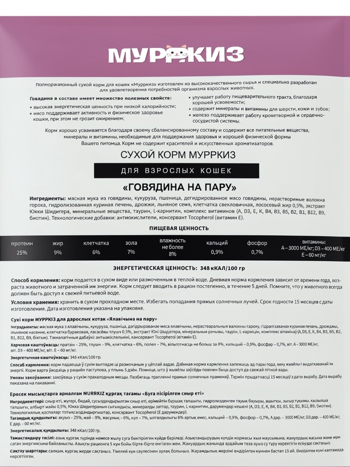 Полнорационный сухой корм для кошек «Мурркиз» изготовлен из высококачественного сырья и специально разработан для удовлетворения потребностей организма взрослых животных. Говядина в составе имеет множество полезных свойств: