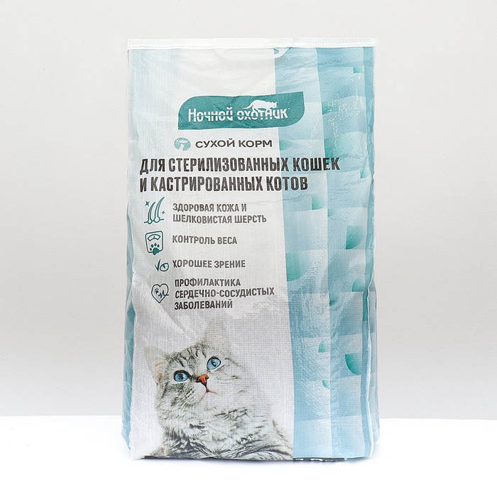 Полнорационный корм сухой для кошек премиум-класса «Ночной охотник» для стерилизованных кошек и кастрированных котов изготовлен из высококачественного сырья и специально разработан для удовлетворения потребностей организма взрослых животных. У кастрированных котов и стерилизованных кошек наблюдается склонность к избыточному весу. Рецептура корма включает высокое содержание протеина для поддержания мышечной массы и сниженное количество жира для профилактики ожирения.