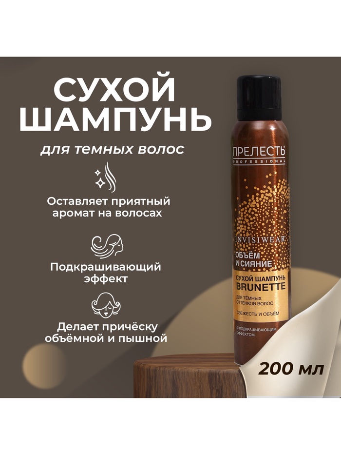 Сухой шампунь для шатенок и брюнеток Прелесть Professional Invisiwear, Объем и сияние, с подкрашивающим эффектом абсорбирует жирный блеск волос и головы, делает локоны объемнее, помогает подкрасить корни волос и поддерживать их цвет между окрашиваниями.