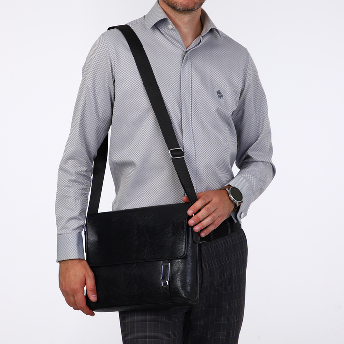 Эта черная мужская сумка-планшет сочетает деловой стиль с практичной организацией пространства. Большой формат 32x24 см вмещает документы, планшет и ежедневные необходимые мелочи. Полукаркасная конструкция сохраняет форму, обеспечивая удобство при переноске на плече.