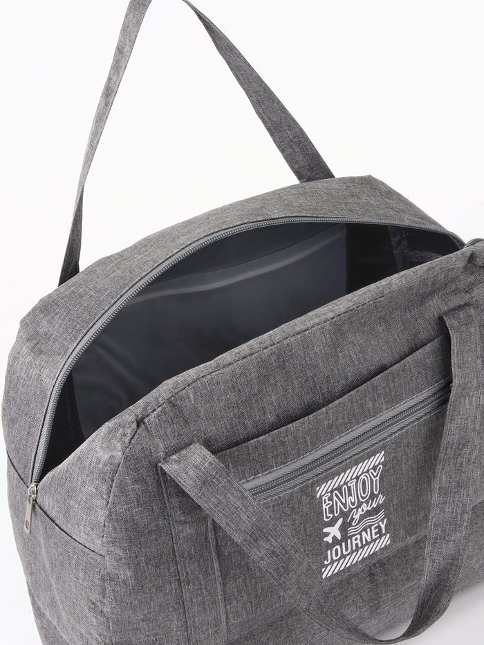 Серая дорожная сумка на молнии из прочного полиэстера. Среднего размера, рассчитана для удобного размещения вещей в коротких поездках. Универсальный аксессуар для мужчин и женщин, подходящий для любых целей. Легкая и практичная модель для комфортных путешествий.
