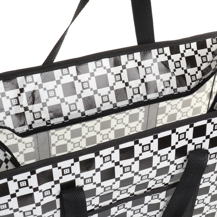Эта вместительная хозяйственная сумка станет вашим надёжным помощником в бытовых делах. Контрастное сочетание чёрного и белого цветов с геометрическим рисунком выглядит современно и практично. Просторное внутреннее пространство легко вмещает всё необходимое для поездки на дачу, крупных покупок или хранения вещей.