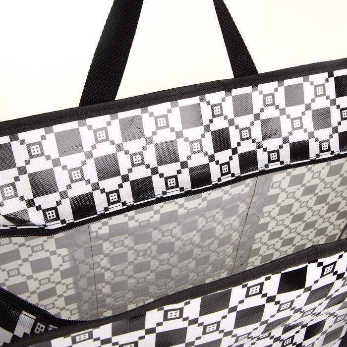 - Геометрический черно-белый рисунок делает сумку заметной и легко узнаваемой