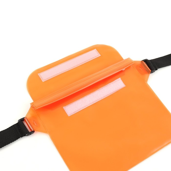 Сумка изготовлена из мягкого ПВХ и оснащена четырмя этапами защиты: три застежки типа zip lock и фиксация зип-замков в скрученном состоянии с помощью липучки - за счет этого обеспечивается защита содержимого от воды. Прозрачность материала позволяет пользоваться сенсорным экраном смартфона, не вынимая его из сумки.
