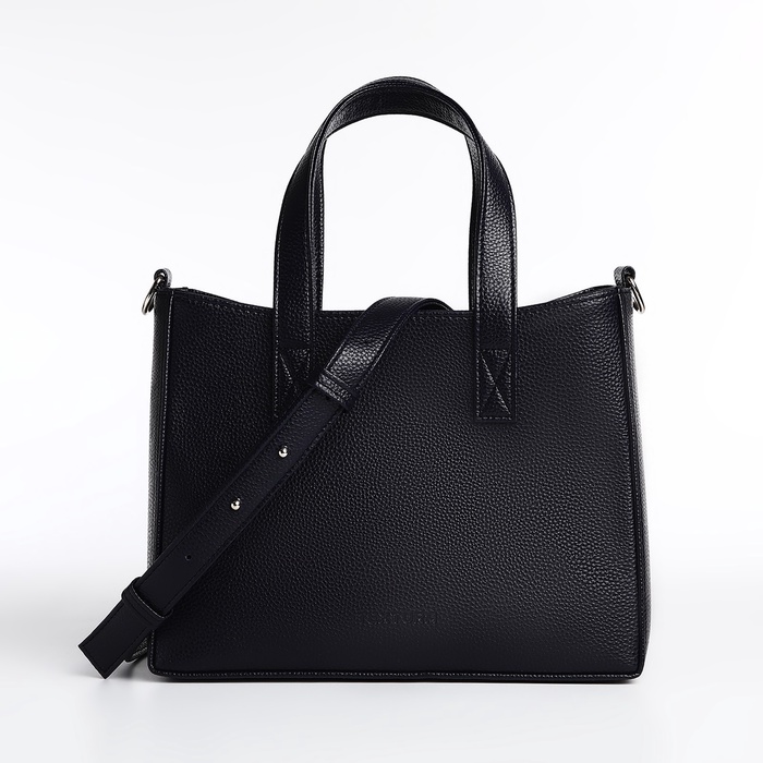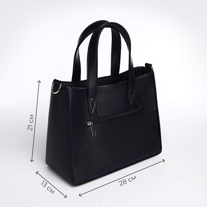 Сумка достаточно вместительная, чтобы разместить все необходимые вещи — от документов до косметички, но при этом она сохраняет компактные размеры, что делает её удобной для ношения в руках или на плече.