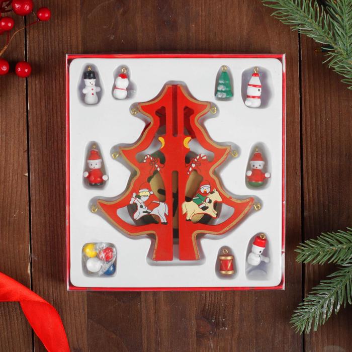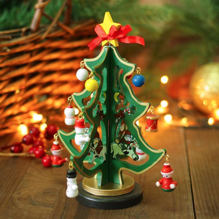 Симпатичные интересные подвески можно расположить по своему вкусу, а золотая звёздочка с красным бантом на макушке завершает тожественный образ лесной красавицы. Деревянная ель на подставке не замёт много места и будет радовать глаз в зимние праздники на протяжении многих лет.
