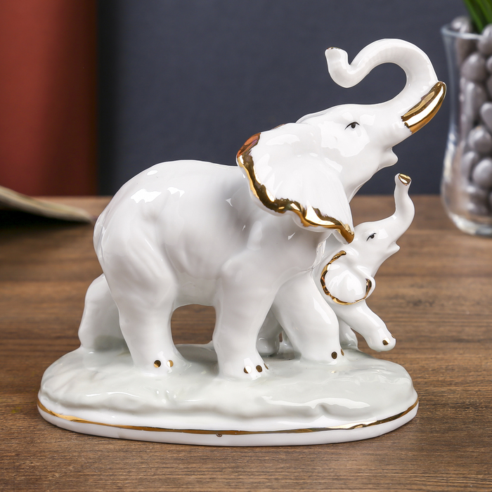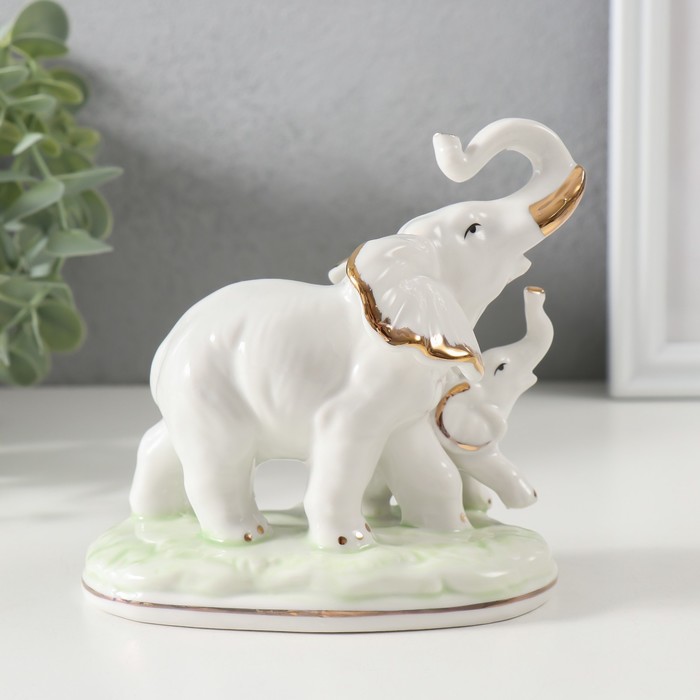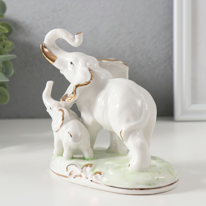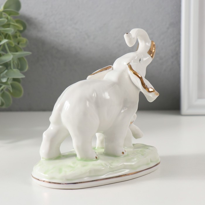 Сувенир керамика "Прогулка слона со слонёнка" белый с золотом 12,2х12,7х7,2 см