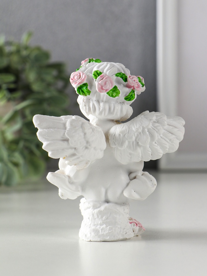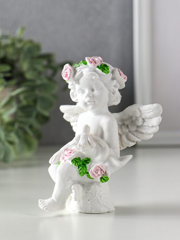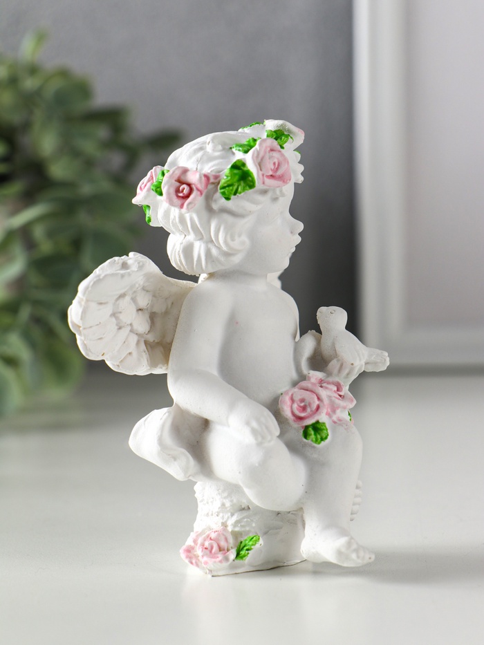 Сувенир полистоун "Ангелок в цветочном венке, с птичкой на ладоне" белый 9,5х6,5х10,5 см