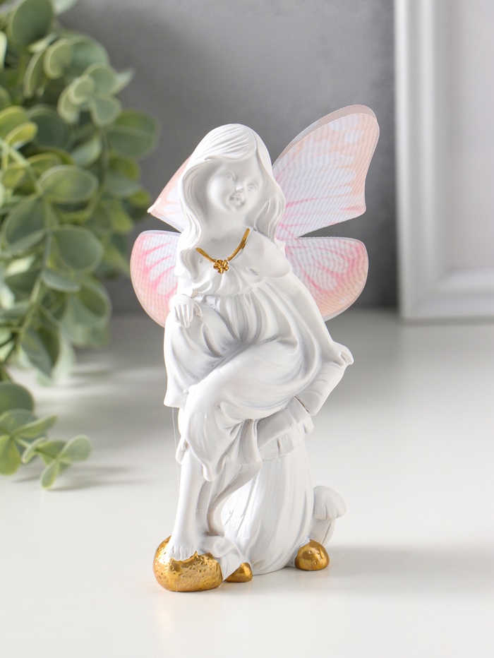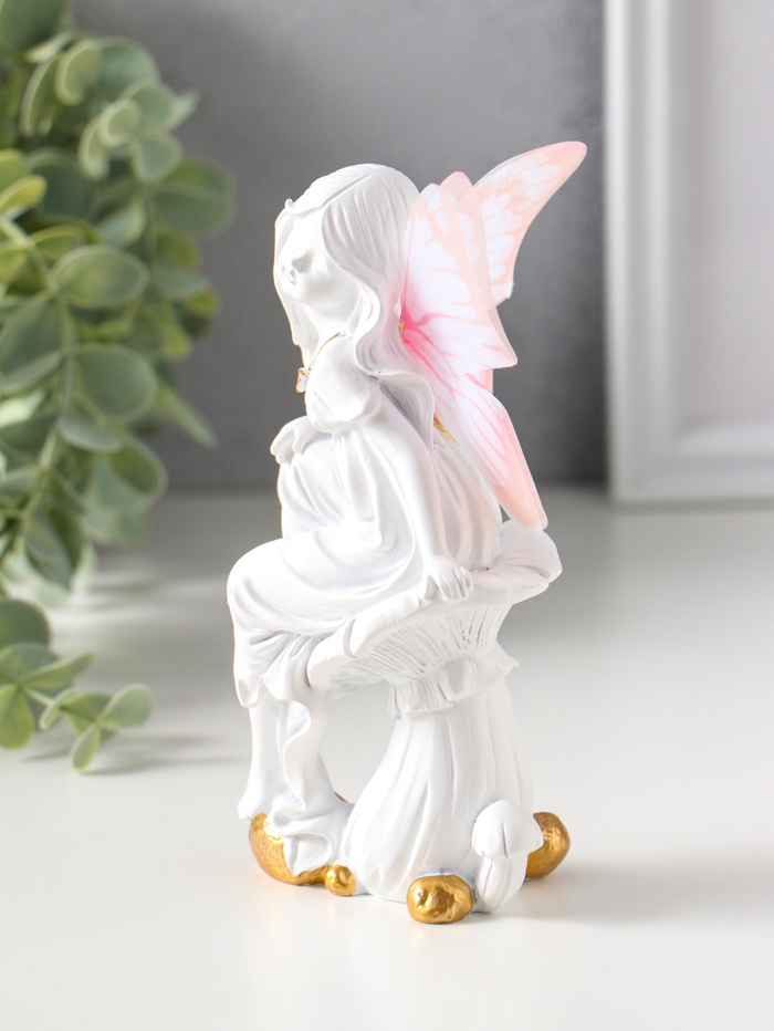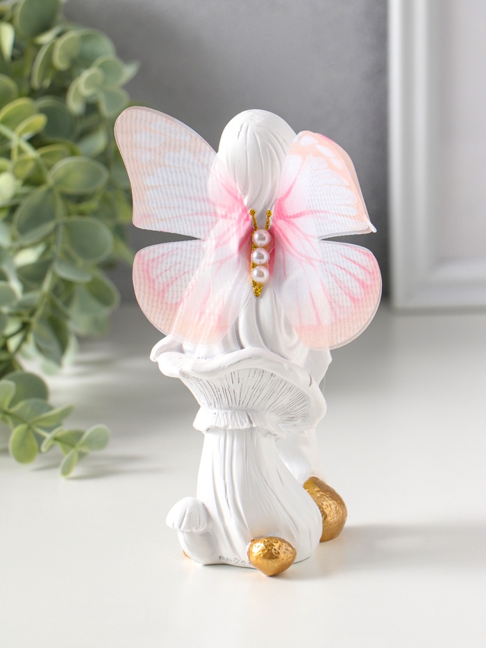 Сувенир полистоун "Девочка-бабочка на грибочке" белый 5,5х7х14,5 см