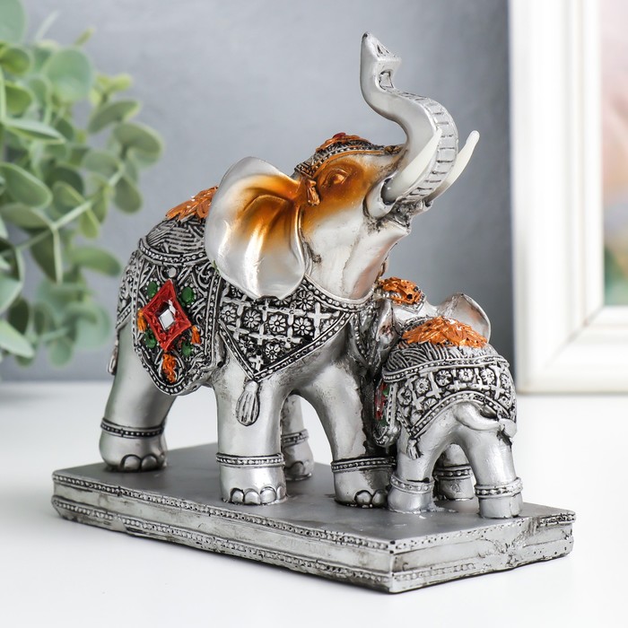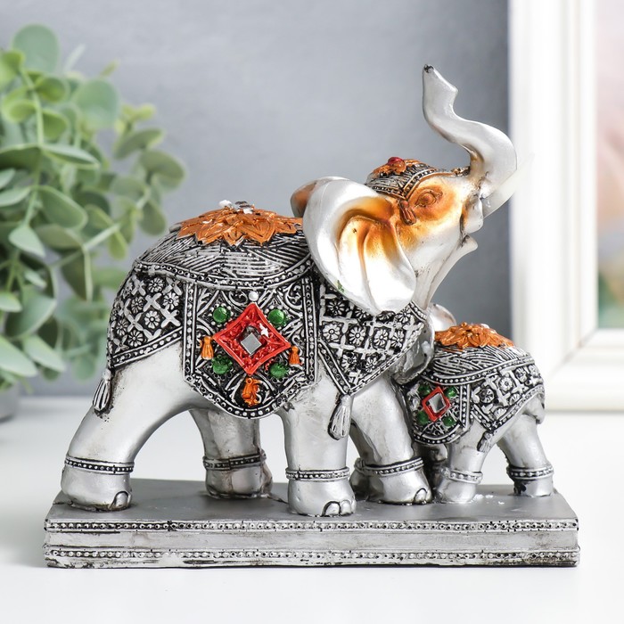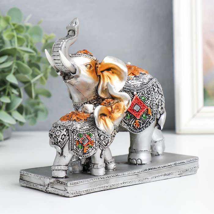 Сувенир полистоун "Слониха со слонёнком в попоне с ромбом" серебро 14х6,3х13,5 см