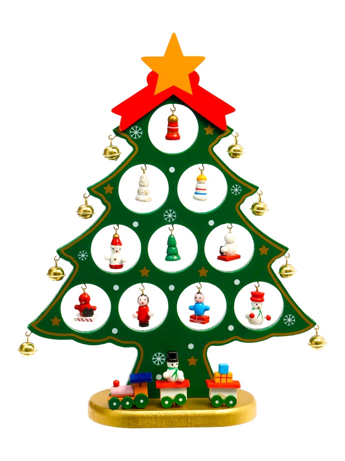 Симпатичные интересные подвески можно расположить по своему вкусу, а золотая звёздочка на макушке завершает тожественный образ лесной красавицы. Деревянная ёлочка на подставке не замёт много места и будет радовать взор в зимние праздники на протяжении многих лет.
