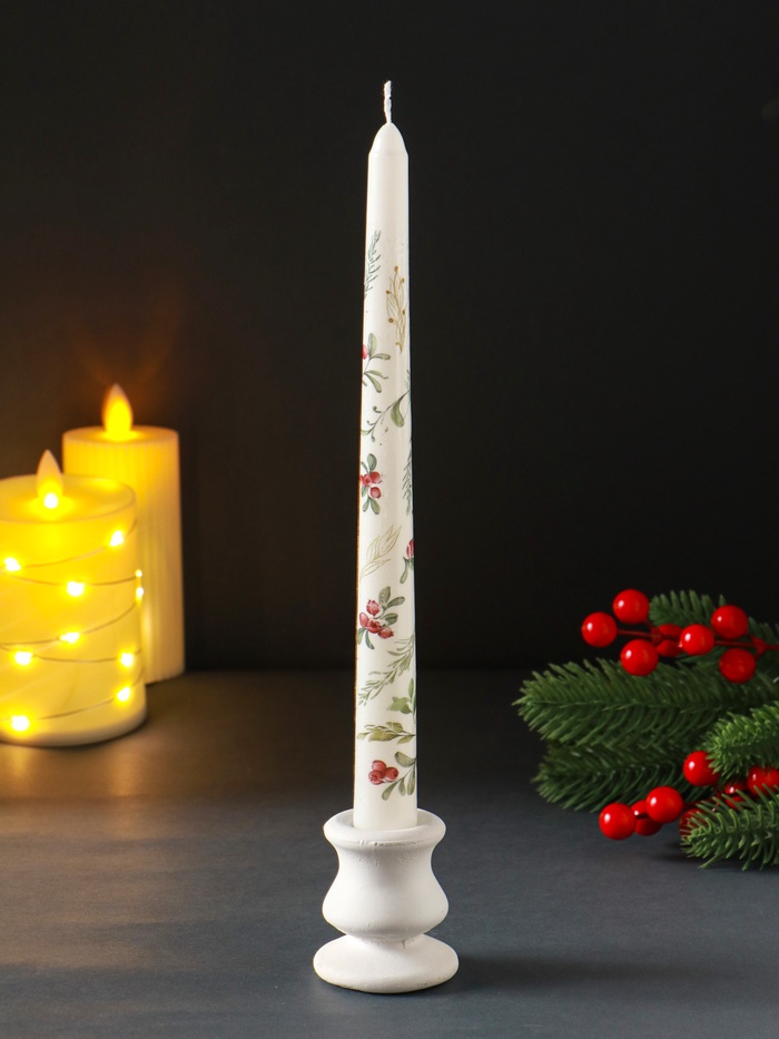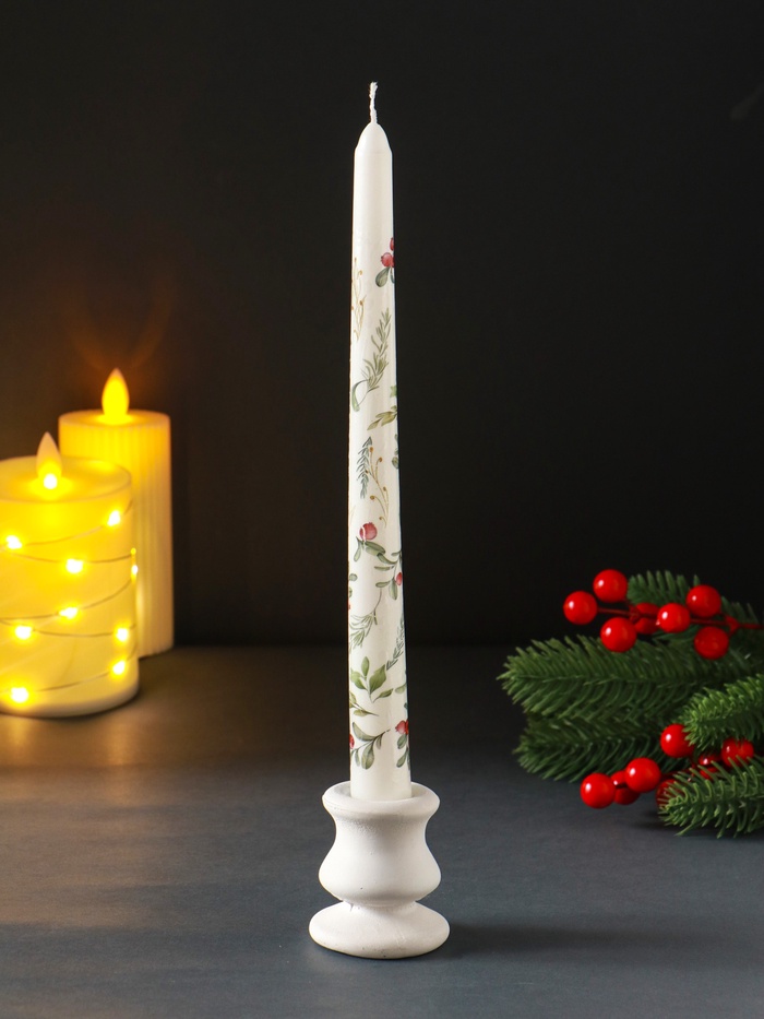 Эта высокая белая свеча создаёт в доме атмосферу зимнего праздника и уюта. Её классическая форма и чистый цвет делают её универсальным украшением интерьера, которое гармонично смотрится в канделябре или подсвечнике.