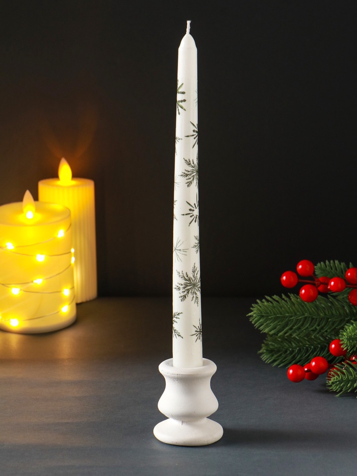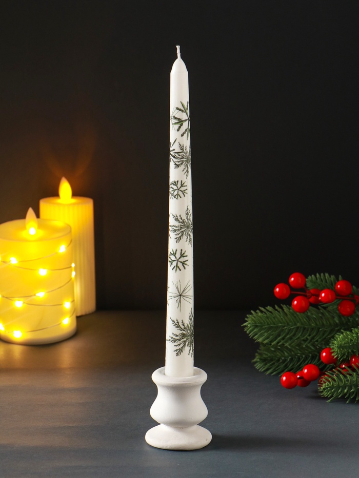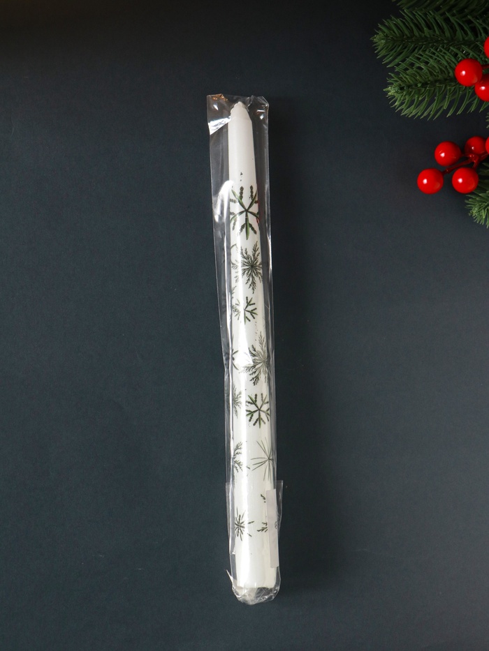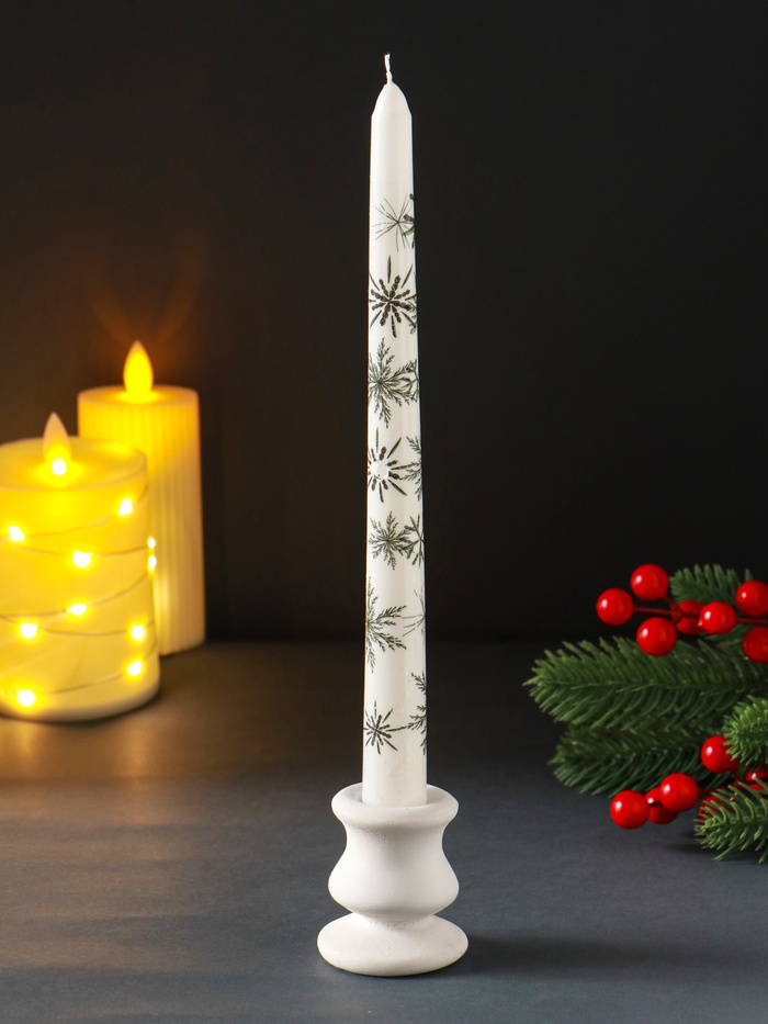 Эта высокая белая свеча с новогодними снежинками создаёт в доме атмосферу уюта и спокойного зимнего вечера. Её классическая форма и изящный декор делают её самодостаточным элементом праздничного интерьера.