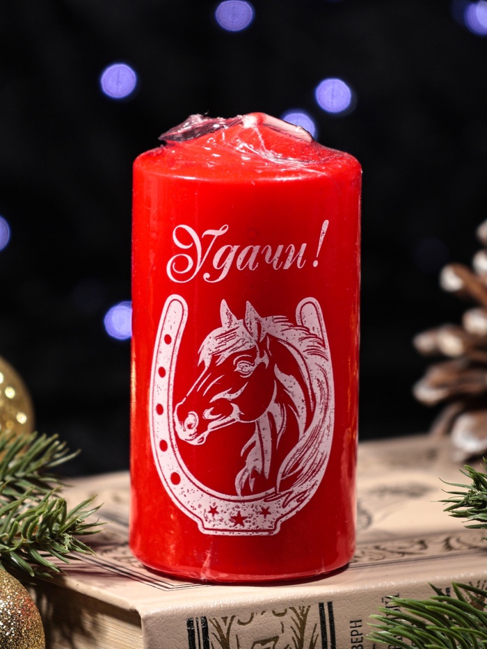 Красный цвет свечи традиционно ассоциируется с энергией, страстью и успехом, а изображение лошади в подкове усиливает её символическое значение — это талисман, который притягивает удачу и оберегает дом от негатива. Изготовленная из качественного парафина, свеча горит ровно и долго, не коптит и не теряет форму, что делает её не только красивой, но и практичной.