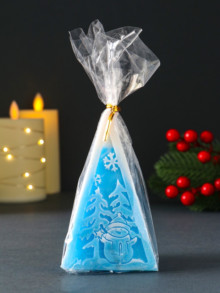Эта голубая свеча в виде снеговика станет тёплым дополнением новогоднего декора. Её мягкий свет создаст в доме атмосферу спокойствия и волшебного ожидания праздника. Пирамидальная форма напоминает о первом снеге и зимних забавах, превращая обычный вечер в маленькое предвкушение чуда.