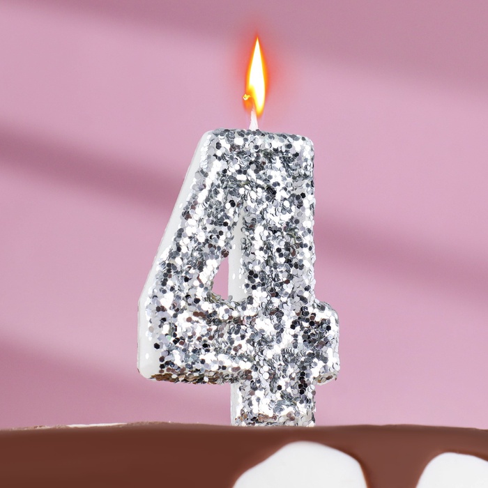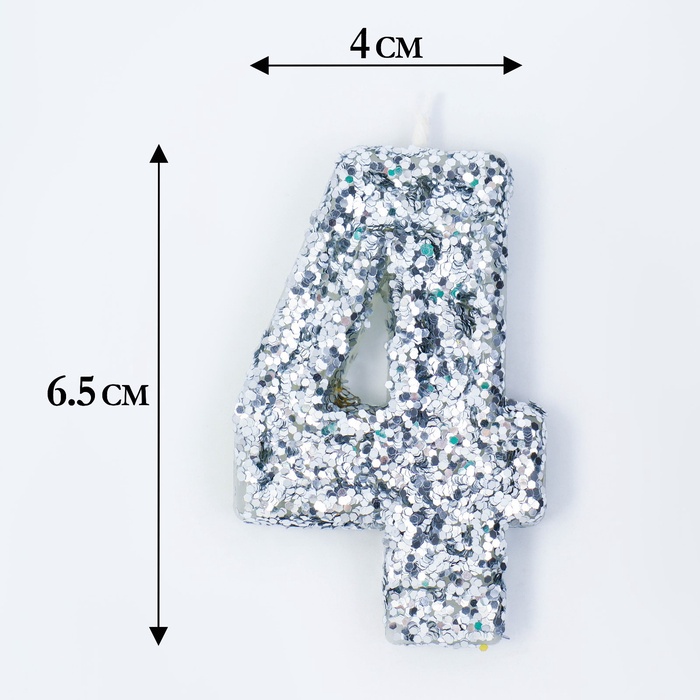 Свеча в торт «Блестки», цифра "4", серебро, 6,5 см