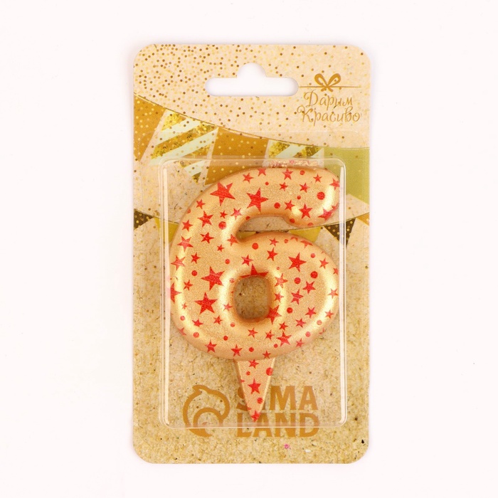 Свеча в торт «Саната», цифра 6, золотая с красными звездами, 5.5 см