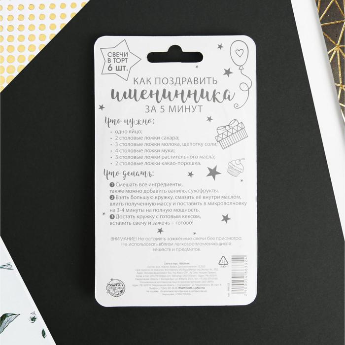 Свечи для торта - это неотъемлемый атрибут праздника. Набор свечей станет прекрасным украшением торта и других кондитерских изделий по случаю дня рождения, юбилея и любого другого торжества. Украсьте угощение стильными свечами, чтобы сделать особенный день ещё более ярким и незабываемым. Свечи укомплектованы пластиковыми держателями для удобства размещения в торте или другом кондитерском изделии. Изготовлены из высокоочищенного пищевого парафина, который не влияет на вкусовые качества блюд, а удобная упаковка помогает сохранять свечи при длительном хранении и транспортировке.