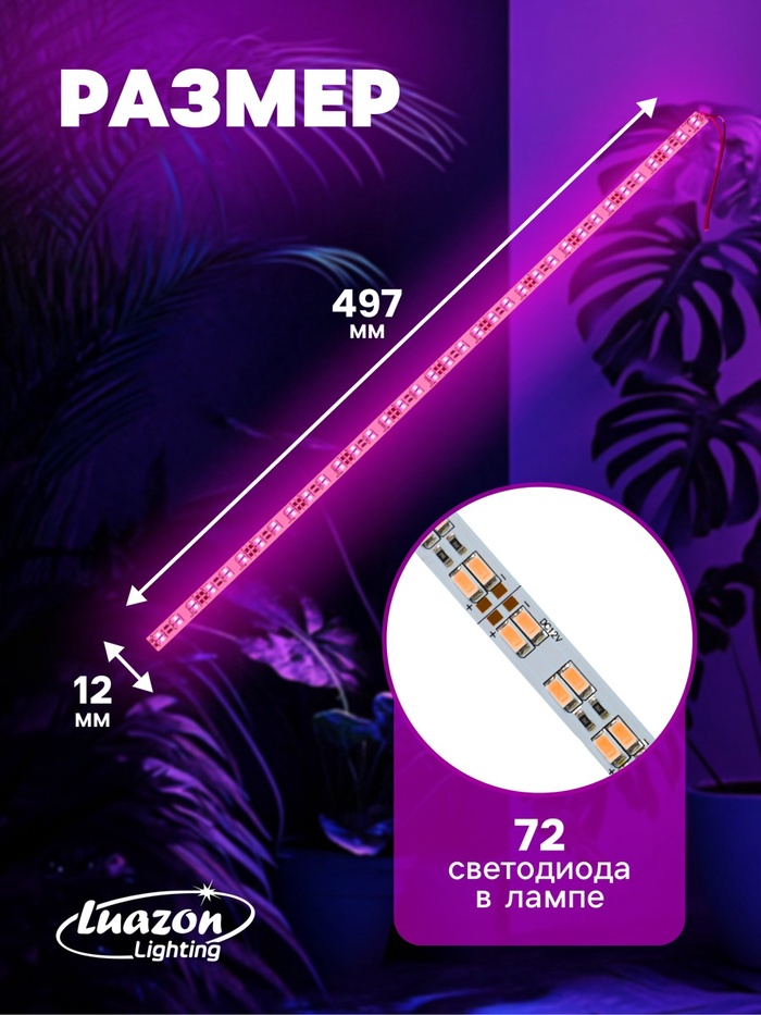 Светильник линейка, для растений, 0.5 м, 14 Вт, SMD5630, 72 led, ФИТО, 12 В