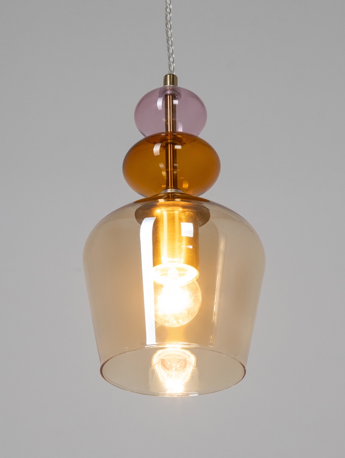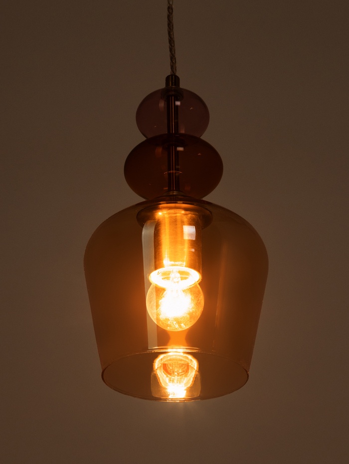 Подвесной светильник с янтарным стеклянным плафоном создаёт мягкое и тёплое освещение, наполняя пространство уютной атмосферой. Элегантное сочетание золотого основания и формы «бокал» придаёт интерьеру выразительность и современный характер.