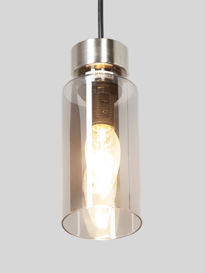 Подвесной светильник с цилиндрическим плафоном и хромированной отделкой создаёт чёткое направленное освещение, выгодно подчёркивая линии и фактуры интерьера. Лаконичные формы и современный дизайн делают его универсальным элементом освещения для различных по стилю помещений.