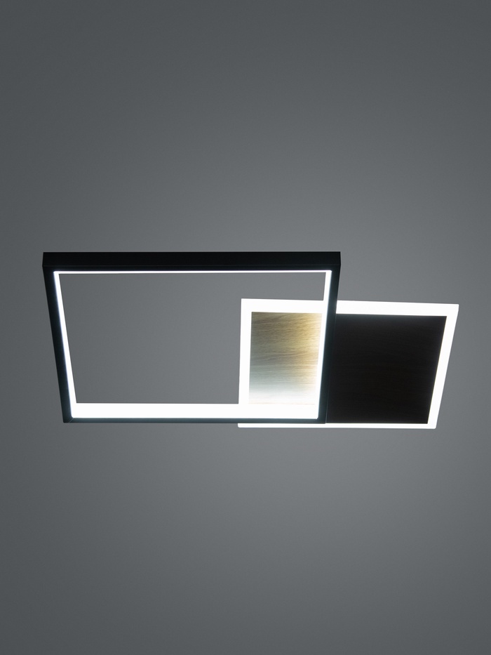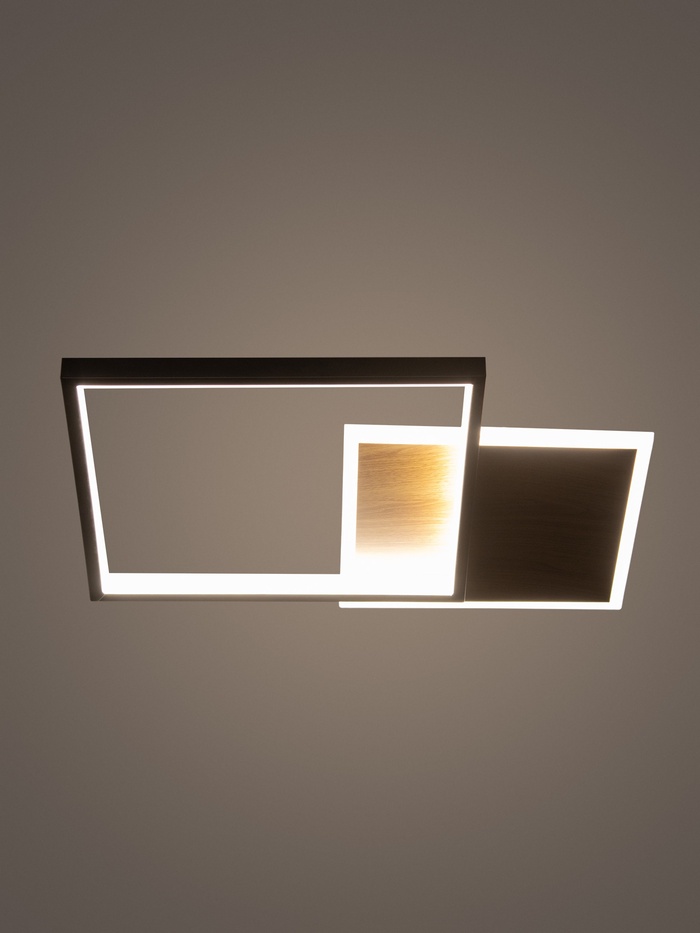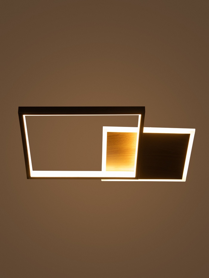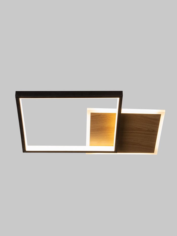 Комбинация чёрного корпуса с декоративными элементами под дерево формирует выразительный современный образ, который легко вписывается в интерьер и добавляет ему визуальной глубины. Плоская конструкция высотой всего 6 см аккуратно смотрится на потолке и не утяжеляет пространство.
